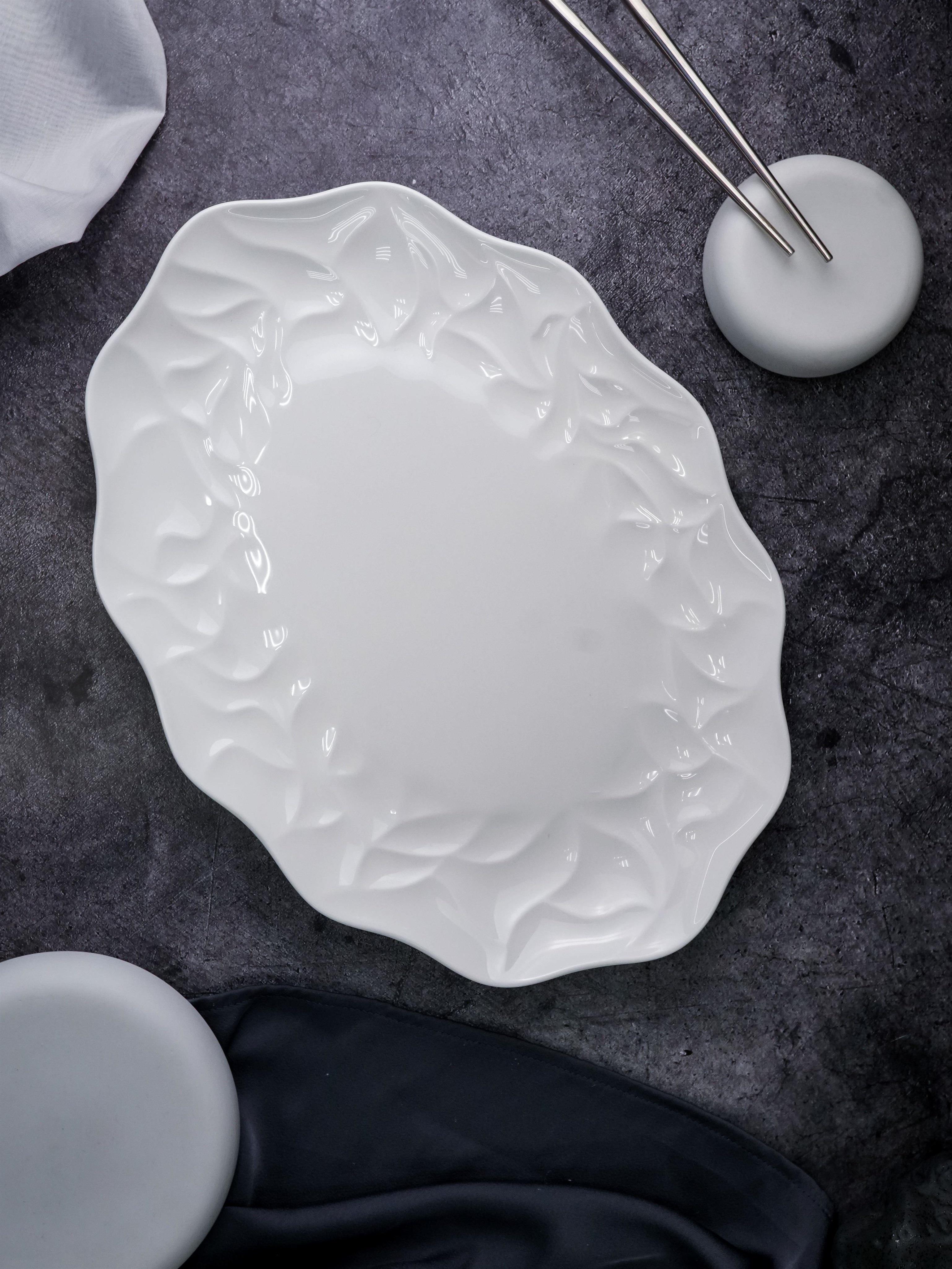Изысканное овальное блюдо из костяного фарфора размером 36x26 см. Дизайн в стиле оригами придает ему скульптурную форму с четкими геометрическими линиями, которая эффектно смотрится в любой сервировке.